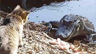 المواجهة المثيرة رصدتها كاميرات أحد زوار محمية كاجون برايد في ولاية نيو أورليانز، حيث خرج التمساح من مستنقع ليلتهم وجبة من لحوم الدجاج فاقترب منه القط الشجاع وراح يلكمه بمخالبه في محاولة لانتزاع كمية من اللحوم.