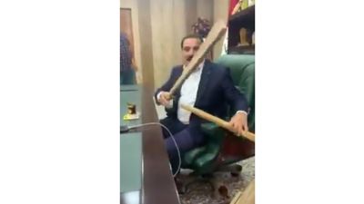 وظهر السياسي العراقي وهو يتناول عصاتين من تحت طاولة جلس أمامها، ملوّحًا بهما بطريقة تهديدية مع الوعيد اللفظي بإلحاق الأذى بمن يوجّه لهم الرسالة.