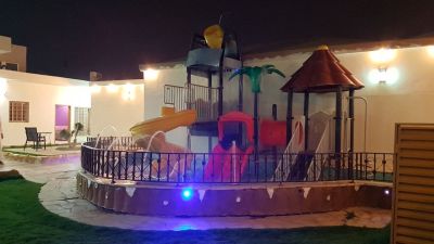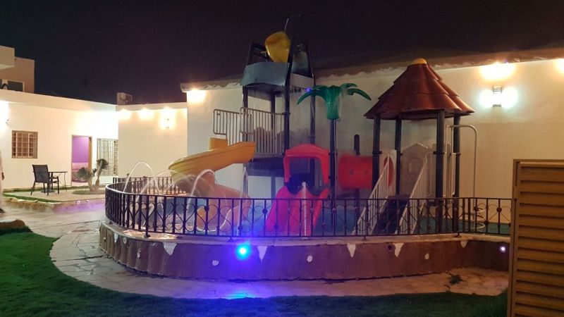 أما المطبخ فيلبي حاجات الزوار من حيث وجود الموقد والثلاجة والفرن الكهربائي هذا بالنسبة لما يحويه الشاليه، أما في الخارج فيوجد مسبح محاط بسياج من الزجاج لتأمين الحماية إضافة للألعاب المائية، ولعشاق السهرات والجلسات الخارجية صممت جلسات ضمن المساحة الخضراء تتكون من الكنب المريح وهي مظللة بشكل أنيق يضمن راحة الزوار مما جعله من أروع شاليهات نمار الرياض.
