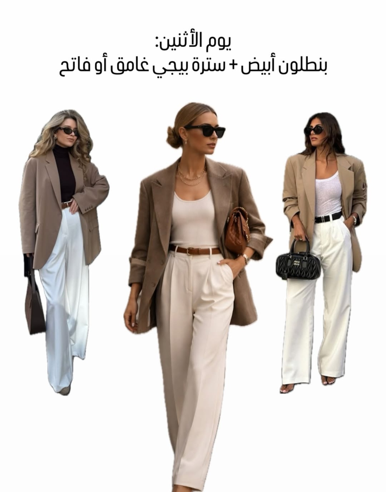 - نسّقي حسب طبيعة عملك؛ إذا كان رسمي جدًا اختاري بدلات كاملة، وإذا كان مرن أكثر يمكنك اعتماد ستايل كاجوال شيك.