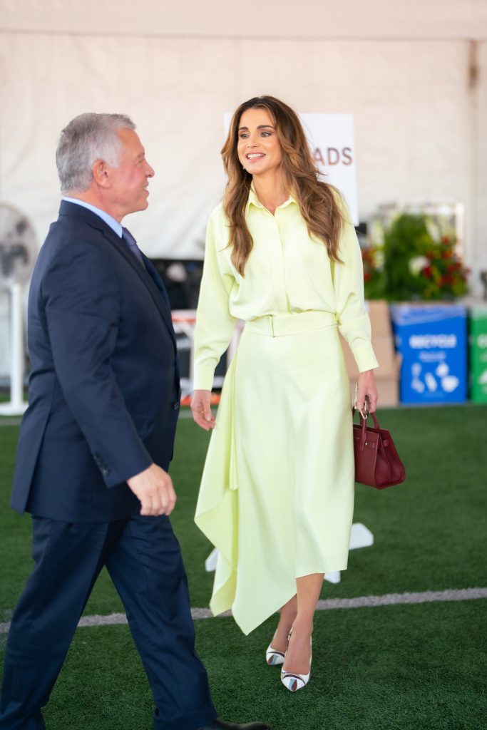 وقد خطفت الملكة رانيا العبدالله أنظار الجميع بإطلالة الفستان الأضفر المشرق والأنثوي الخاطف من علامة الأزياء الأميريكية براندون ماكسويل، كما قد زينته بحزام مزين بال"بكلة" الذهبية، والتي خلقت التوازن بين الجزء العلوي من الإطلالة التي جاءت أيضا بقصة ال(Shirt Dress)، كما جاءت التنورة بقصة غير منتظمة من الأسفل.