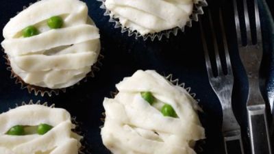 تصفى البطاطا وتعاد إلى الوعاء. تضاف القشدة الحامضة و ¼ ملعقة صغيرة من الملح وتهرس حتى تصبح ناعمة جدا. تنقل إلى كيس المعجنات ويغطى اللحم باشرطة من البطاطا المهروسة التي تشبه شكل المومياء توضع حبتان من البازلاء مكان العينين.