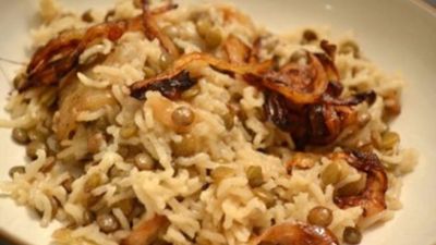 4. في هذه الاثناء، يقلب باقي البصل بالزيت حتى يصبح ذهبيا ويزين به طبق المجدرة. تقدم مع سلطة الخضار الطازجة أو اللبن.