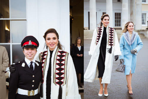 كما تألّقت الملكة رانيا بمعطف على شكل عباءة من تصميم دار سعودية ترتكز تصاميمها على اليد العاملة المحلية وهي ABADIA التي يتواجد القيمون عليها في هذا الأسبوع في إمارة دبي لعرض إبداعاتهم. المعطف المزدان بتطريز بالذهبي والبوردو والأسود وهو مزادن بالفرو وينتمي الى مجموعة farwa. كما انتعلت حذاء كلاسيكياً أبيض من "جيمي تشو"، فيما ارتدت ابنتها الأميرة إيمان معطفاً أزرق باستيل من ماركة MIUMIU وحقيبة من ايف سان لوران.