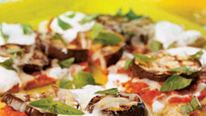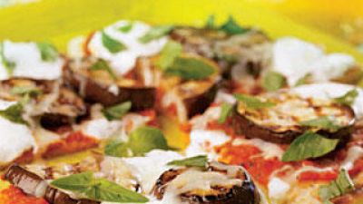 4. توضع قطع الخبز على سطح نظيف وتوضع عليها طبقة من الصلصة ثم توضع شرائح الباذنجان، وترش بأنوا الجبن المختلفة. ثم توضع على الشواية حتى تذوب الجبنة.