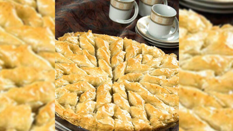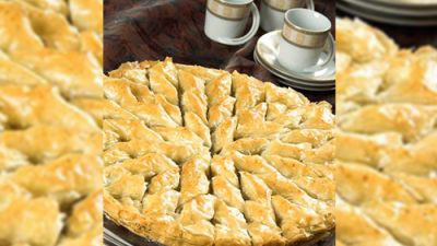 6. يتمّ إدخال الصينية إلى الفرن لمدّة 25 إلى 30 دقيقة، وذلك إلى أن تصبح الرقائق ذهبية اللون. وعندما تخبز، يوزّع القطر فوقها، وتترك لتبرد قبل التقديم.