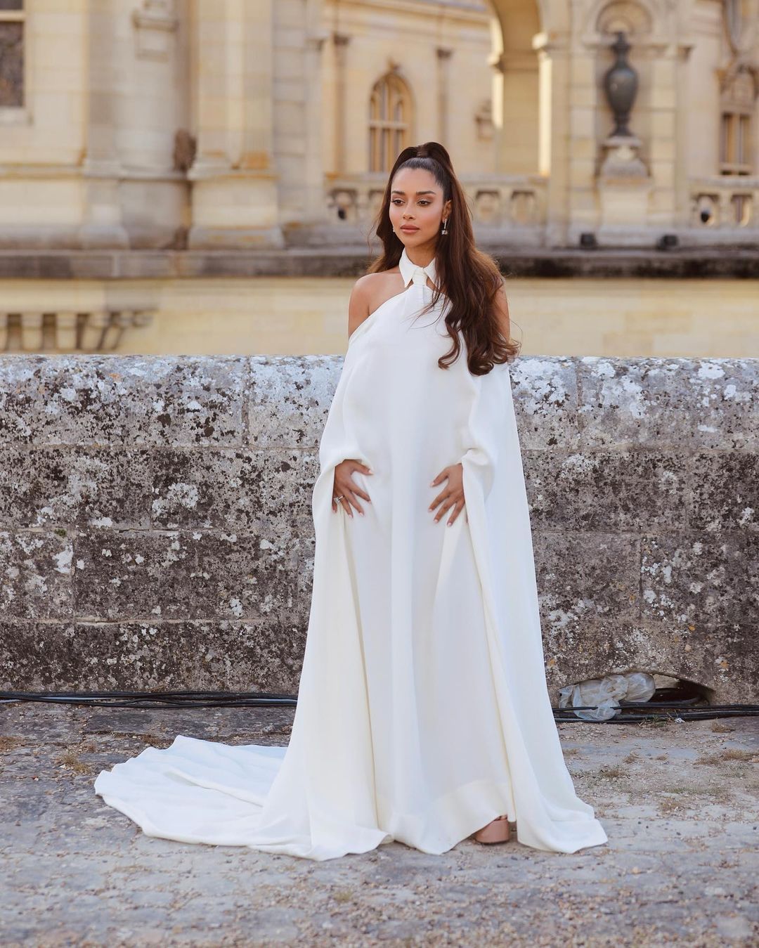 حضرت النجمة بلقيس عرض أزياء العلامة الإيطالية "فالانتينو غارافاني" لمجموعة الأزياء الراقية "أوت كوتور" خريف وشتاء 2023-2024 الذي أقيم في قصر فرساي، بإطلالة باللون الأبيض النقي من مجموعة خريف وشتاء 2023 التي عرضت مؤخرا في مارس فارتدت فستان فضفاض برقبة مغلقة وأكمام منسدلة على الذراعين وطويلة، وجاء الفستان مريحًا وطويلًا حتى أسفل ليظهر أناقة بلقيس وجمالها.
