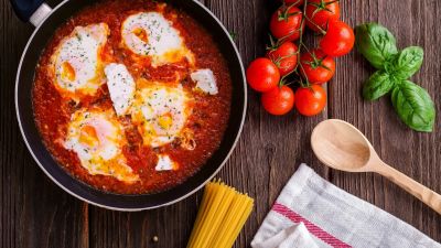 ضعي البيض في الفرن الساخن على 180 مئوية لينضج من الأعلى لمدة 10 دقائق.