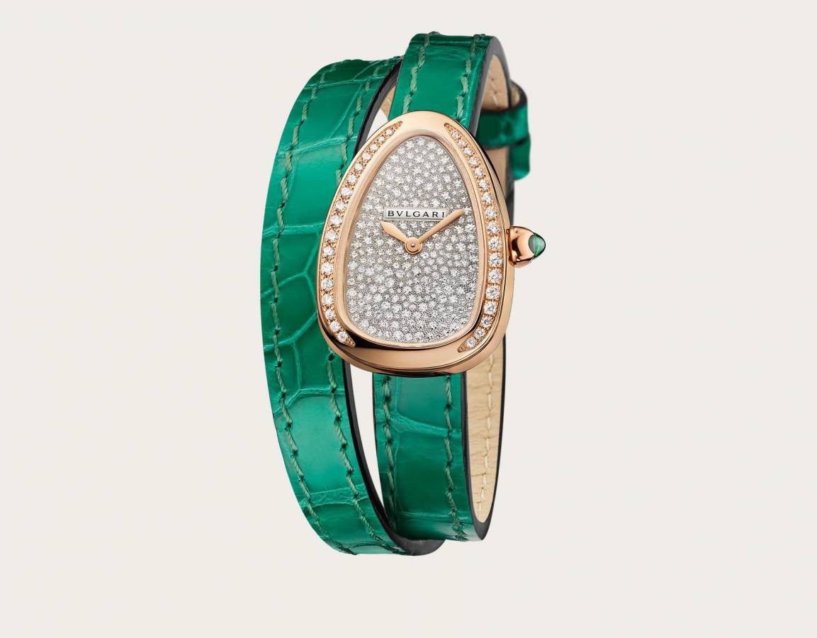 ساعة سربنتي مرصعة بالكامل بالماس ومزودة بسوار من الجلد الأخضر