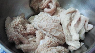 4- نحضر مزيجاً من الطحين، والملح، والخل، ونضعه في وعاء عميق ونضع الكرشة فيه وننقعها مدة ساعة للتخلص من الشوائب والروائح غير المرغوب بها، وندعكها بالمقادير جيّداً بين الحين والآخر.