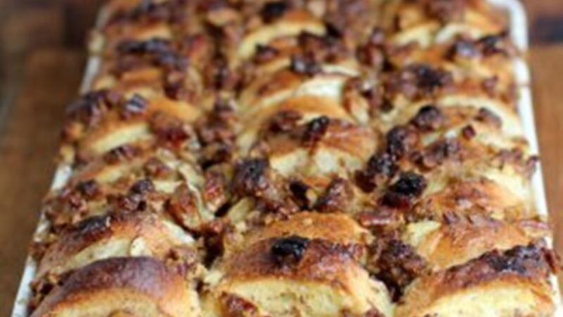 طاجن لذيذ من الخبز والموز والبيكان. مناسب كوجبة فطور أو كحلوى في المساء.