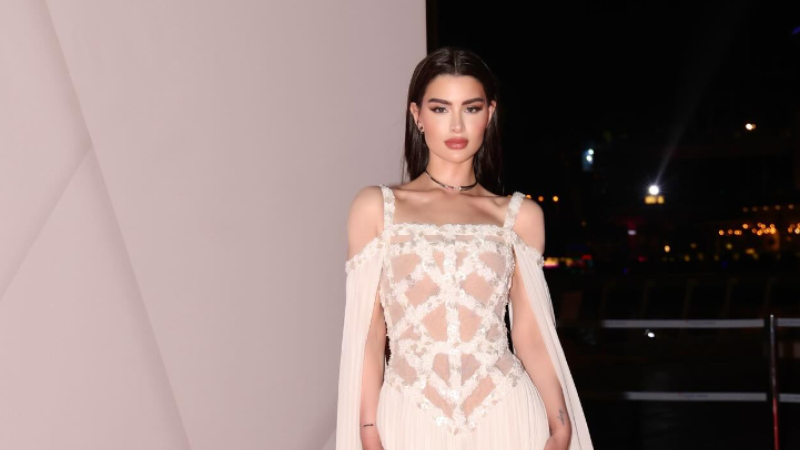 كما جاءت تنورة الفستان بقصة ساحرة ومنسدلة على قوامها بكل أريحية كفستان الأميرات، وبذات اللون الأبيض العاجي الغامق الذي يلامس حدود اللون البيج.
