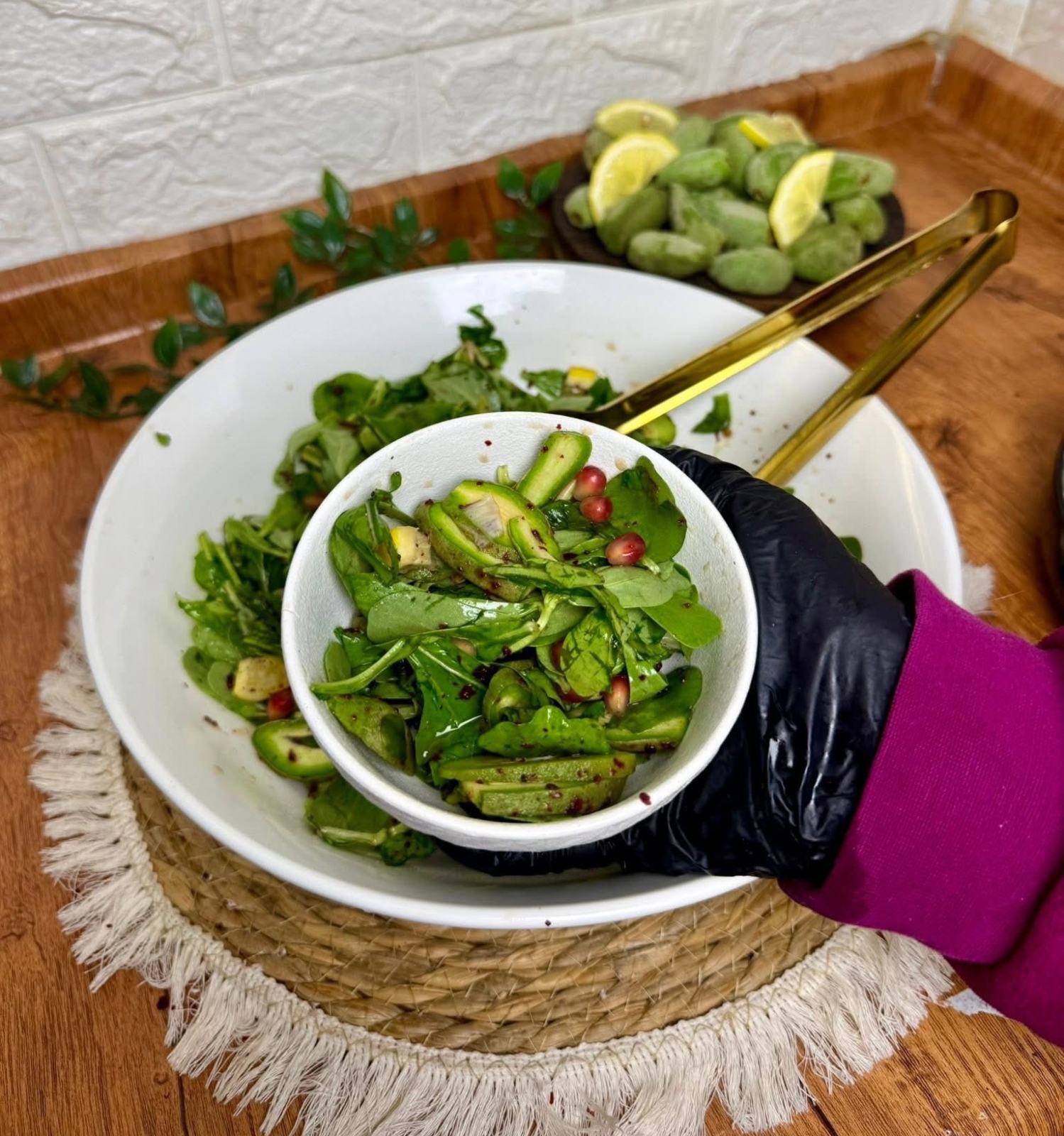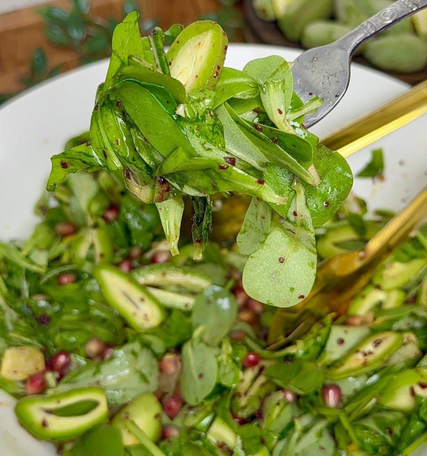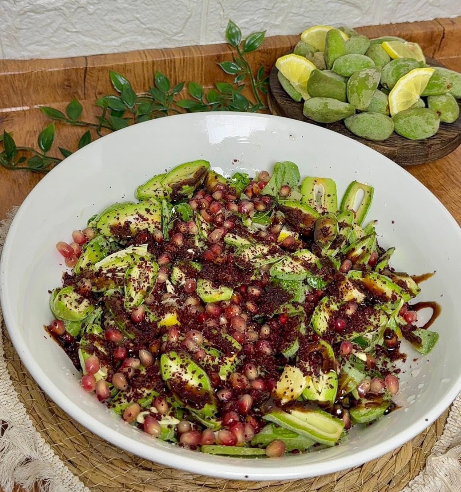 - ثم أضيفي الرمان، ثم تبّلي بالملح، عصير الليمون، السماق، ودبس الرمان.