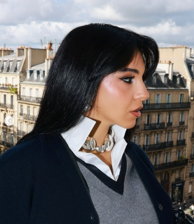حضرت الفنانة المصرية في جادة "شامب دو مارس" (Champ De Mars) في باريس لحضور عرض أزياء علامة الأزياء الفرنسية "ميو ميو" (Mui Mui) لموسم ربيع وصيف 2025 للأزياء الجاهزة، من تصميم المصممة الإيطالية العملاقة، ميوشيا برادا.