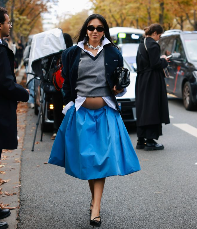 واختارت سلمى أن تطل بتنورة ذات خصر منخفض بتصميم منفوخ "كلوش" كامل، وبطول "ميدي" باللون الأزرق البحري العميق وبقماش ال"ساتان" واا"سكوبا" الأنيق، واختارت سلمى هذه التنورة التي كشفت عن بطنها المنتفخ من مجموعة أزياء العلامة "ميو ميو" لخريف وشتاء 2024-2025.