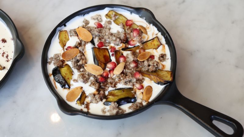- يُوزّع في طبق التقديم، خليط الباذنجان واللحم، ثم يُسكب فوقه مزيج اللبن والطحينة.