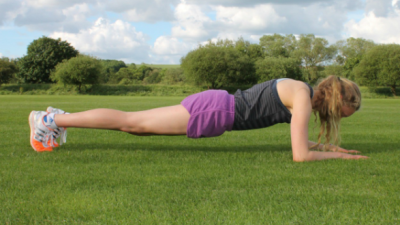 - استلقِ على بطنك ثم ارفعي جسمك بحيث يستند على ساعد الذراعين وأصابع قدميك على الأرض. واحرصي على شد كل عضلات جسمك الأساسية لتمنعي الشعور بالألم في ذراعيك أو قدميك.