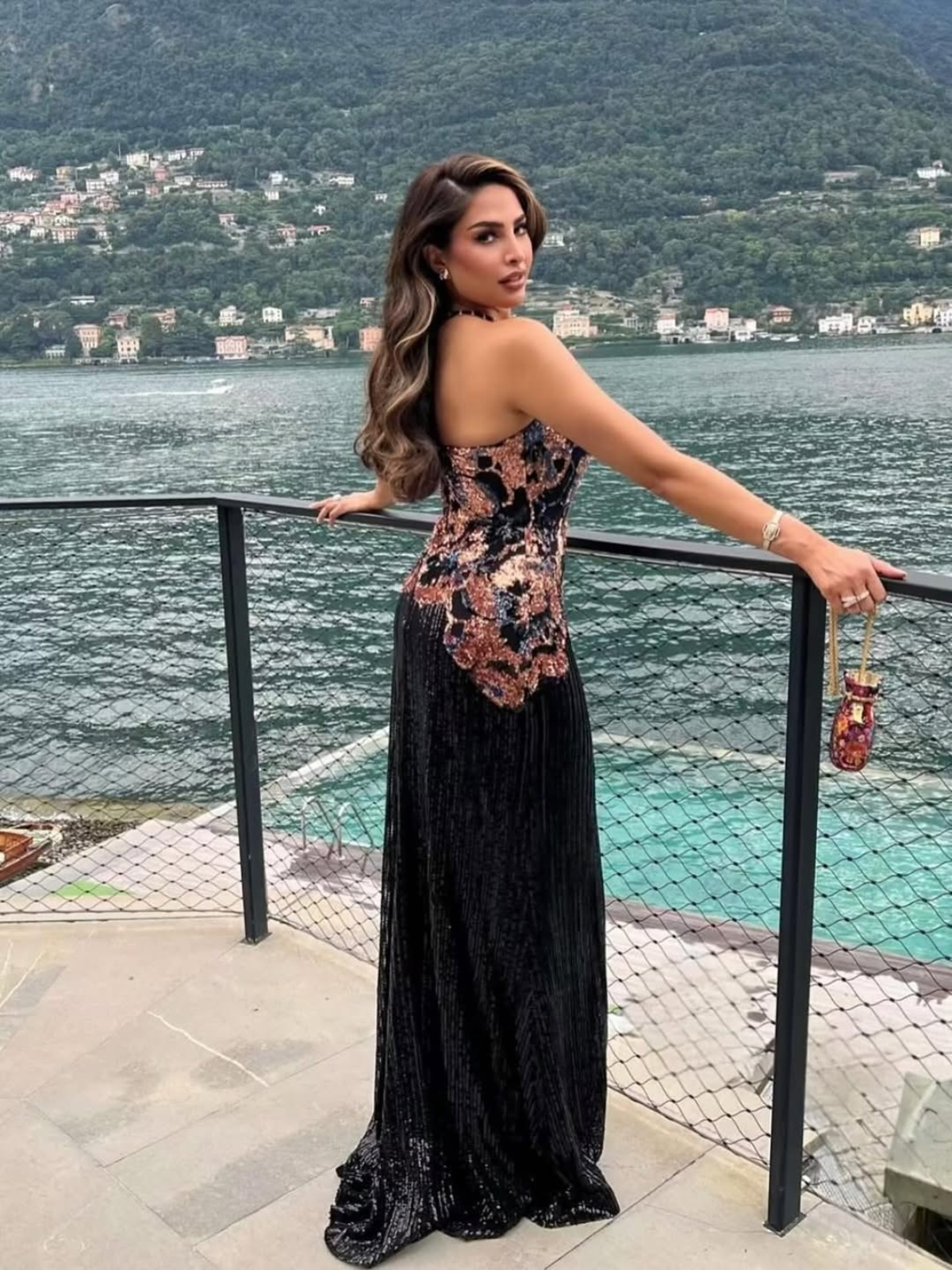 اختارت فوز الفهد فستان طويل جاء من الأعلى بقصة السترابليس الراقي الأنيق، جاء الفستان بطبقتين من قماش الترتر باللون الأسود ومن جهة الصدر مطرز بالترتر ممزوج على شكل ورود بالروز جولد والفضي والأسود من تصميم المصمم العالمي إيلي صعب، ونسقت معه حقيبة صغيرة ملونة من نفس قماش الفستان.