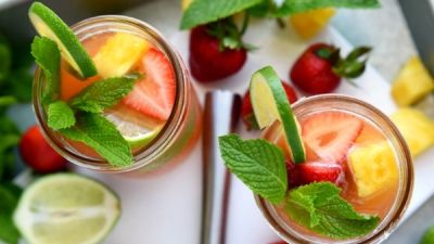 يسكب في ابريق التقديم ويقدم مع كؤوس مزينا مع شرائح الفراولة والليمون والنعناع.