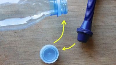 - في غطاء الزجاجة البلاستيكية التي تم ثقبها، يتم إدخال الخرطوم البلاستيكي في الثقب بحوالي 1 سنتيمتر، مع وضع المادة التي تمنع التسرب من داخل وخارج الغطاء، مع تركه إلى أن يجف تمامًا.