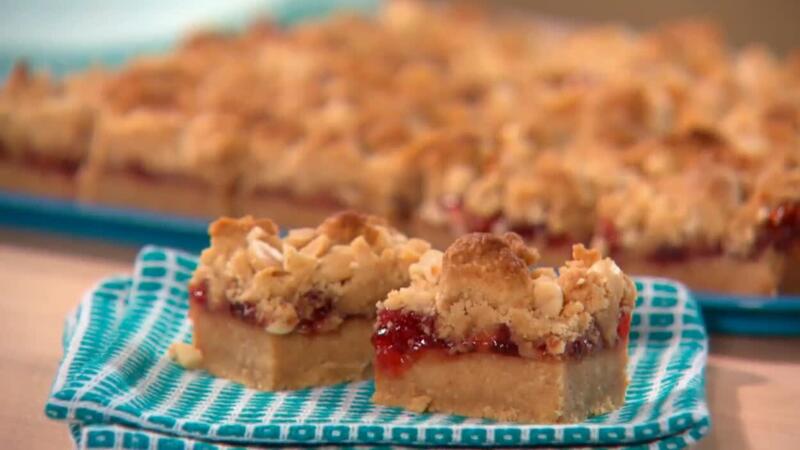 - ضعي 3/4 من عجينة البسكويت في قاع طبق الخبز المُجهز في طبقة متساوية. تأكدي من عدم وجود ثقوب أو فجوات وأن العجين مضغوط. وزعي المربى بالتساوي على سطح عجينة البسكويت. تُسقط عجينة البسكويت المتبقية فوق المربى على شكل قطع صغيرة أو مفتتة. نرش الفول السوداني فوقها ونضغط برفق في فتات المربى والعجين. لا تغطي الفتات والفول السوداني المربى بطبقة صلبة.