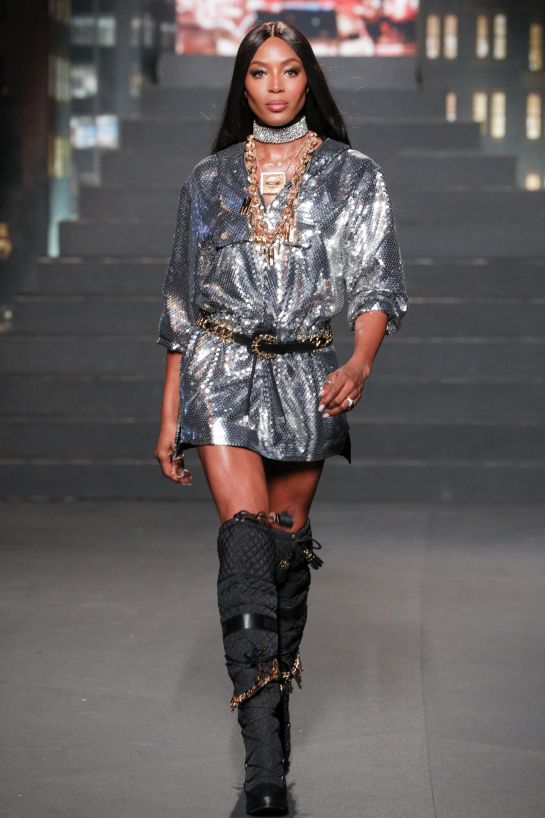 عرض MoschinoXH&M الذي أقيم مؤخرًا في مدينة نيويورك تم خلاله تقديم 45 إطلالة تنوعت بين النسائية والرجالية وتضمنت، بالإضافة إلى الأزياء، تصاميم من الأكسسوارات قدمتها مجموعة من أشهر العارضات العالميات أمثال الأختان جيجي وبيللا حديد، ستيلا ماكسويل، تايلور هيل، مع ظهور لافت للعارضة نعومي كامبل في إطلالة فضية خطفت الأنظار.