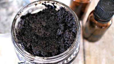 يقاس الفحم المنشط (تأكد من وضعه في مكان محضر مسبقا لانه قد يجعل المكان متسخا!) يضاف إلى خليط مقشر القهوة. يقلب حتى يمتزج جيدا.