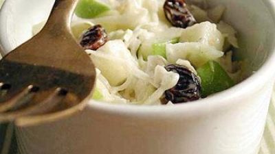 هذه الوصفة عظيمة للأشخاص الذين يحبون المايونيز مع السلطة ولكنهم يخشون من إرتفاع الكولوستيرول. نقدم لكم طريقة جديدة لإضافة المايونيز بدون زيادة الكولسترول السيء. تحتوي هذه السلطة أيضا على مكونات مغذية جيدة غنية بالألياف مثل الزبيب والتفاح، بالإضافة إلى الملفوف.