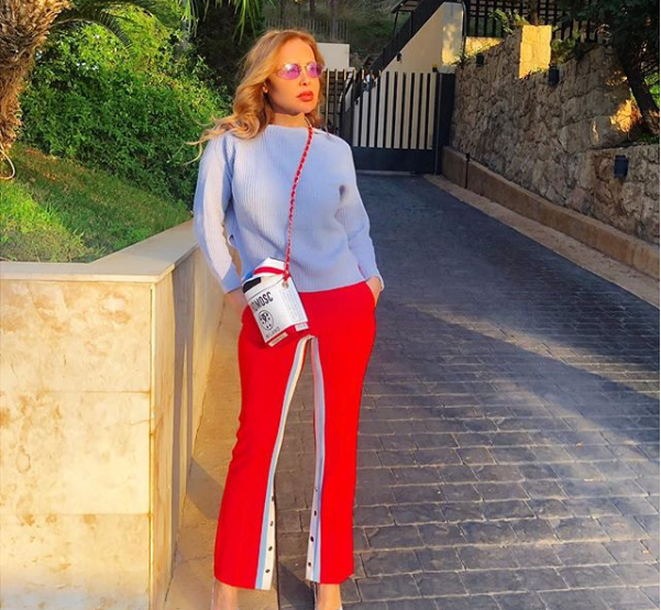 فاختارت الفنانة اللبنانية رولا سعد البنطال الأحمر الواسع مغ الخط الأبيض الجانبي بأزرار ذهبية ،مع كنزة شتوية باللون “بيبي بلو” Baby Blue، مع صندل عالي كاروهات باللونين الأبيض وال “بيبي بلو”، مع حقيبة صغير ذات تصميم غريب.