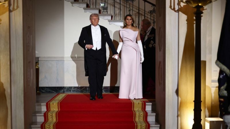 اختارت ميلانيا في مأدبة العشاء الرسمية التي جمعتها بالعائلة الملكية البريطانية، فستانًا ورديًا فاخرًا من دار "ديور" (Dior) ضمن تصاميم الهوت كوتور، جاء بقَصّة أنيقة أبرزت أسلوبها المعروف في المناسبات الرفيعة.