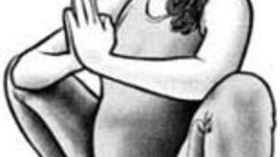 يمكن ضغط الكوعين على داخل الركبتين مع تشابك اليدين أمام البطن .