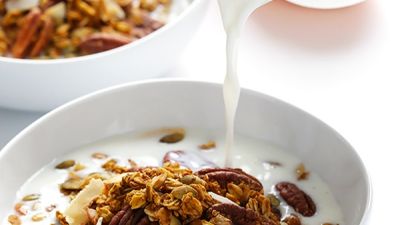 يخلط الشوفا والبيكان وبذور اليقطين في وعاء خلط كبير. في وعاء منفصل، يخفق شراب القيقب، وزيت جوز الهند، وهريس اليقطين ، وتوابل فطيرة اليقطين، والفانيليا والملح معا حتى يصبح المزيج سلسا. يصب خليط شراب القيقب على خليط الشوفان، ويقلب جيدا.