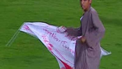 "الراجل أبو جلابيه" هو مصري نزل إلى ملعب مباراة الزمالك والإفريقي التونسي ليلفت أنظار الجميع ويغدو شبيها بالراجل الواقف وراء عمر سليمان!.