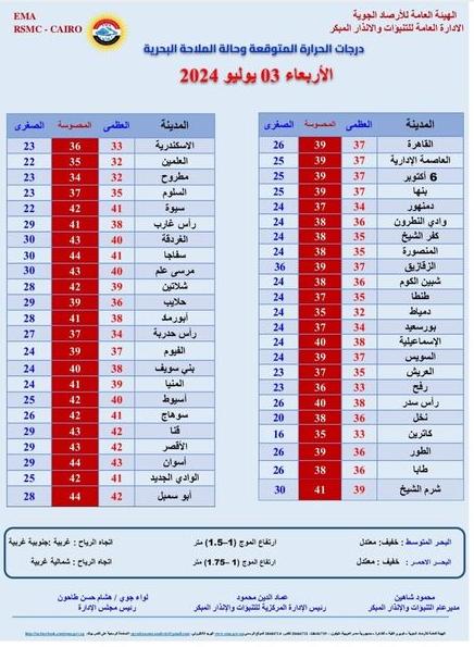 هذا وقد أشارت هيئة الأرصاد إلى أن الطقس اليوم سيكون شديد الحرارة مع رطوبة على مختلف أنحاء الجمهورية، وهذا ما يرجع إلى ارتفاع درجات الحرارة العظمى في الظل والتي ستكون متراوحة ما بين 37 – 38 درجة لكلٍ من مدن القناة، القاهرة الكبرى والوجه البحري.