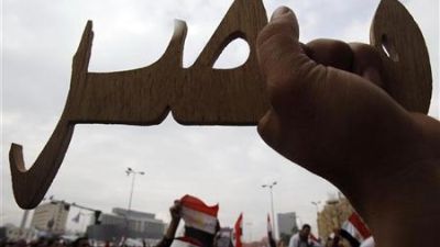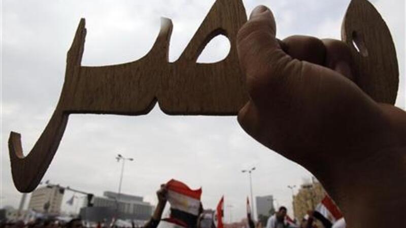 متظاهر مصري يحمل قطعة خشب منحوتة على اسم مصر في ميدان التحرير