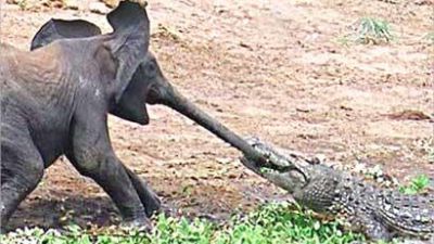 انتصر قطيع من الفيلة لفيل صغير حاول تمساح التهامه بين فكيه. الفيلة وبينما كانت ترعى في احدى الغابات الافريقية قرب بحيرة تستحم فيها وتشرب الماء، حاول تمساح الامساك بفيل صغير على أمل ان يكون وجبة غداء دسمة له. قطيع الفيلة جن جنونه عند رؤية صغيره يتعرض لمحاولة قتل من التمساح، فأخذت الفيلة تركض حوله وتصدر النهيم (صوت الفيلة) ومن ثم تقدمت لإنقاذ صغيرها حتى تمكنت من ذلك وظلت الى جانبه لتتأكد انه على أحسن ما يرام.