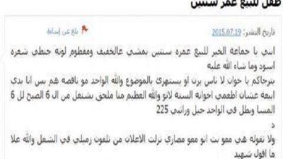 ابني يا جماعة الخير للبيع عمره سنتين بمشي عالخفيف ومفطوم لونه حنطي شعره اسود وما شاء الله عليه بترجاكم يا خوان لا ناس يرن او يستهزئ بالموضوع
