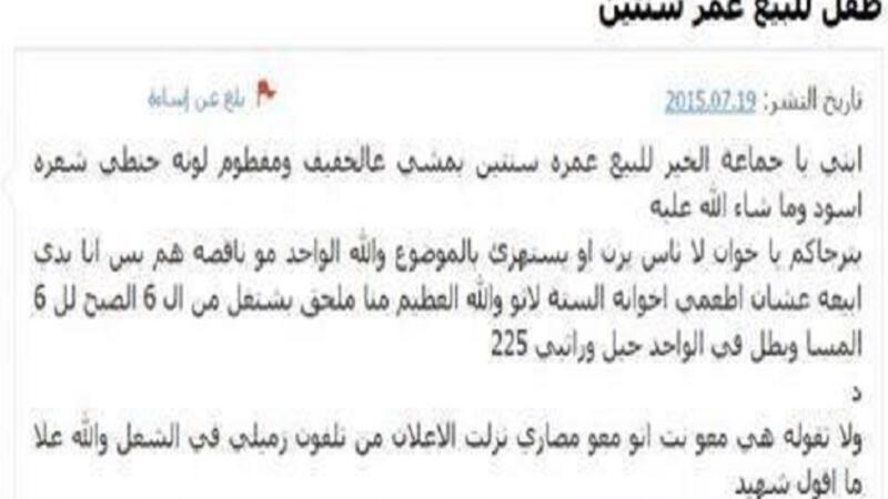 أعلن أحد المواطنين في الأردن عن نيته بيع ابنه الأصغر وذلك عبر أحد مواقع البيع الالكترونية، وذلك بحجة الفقر وعدم كفاية الراتب لكافة أفراد العائلة!