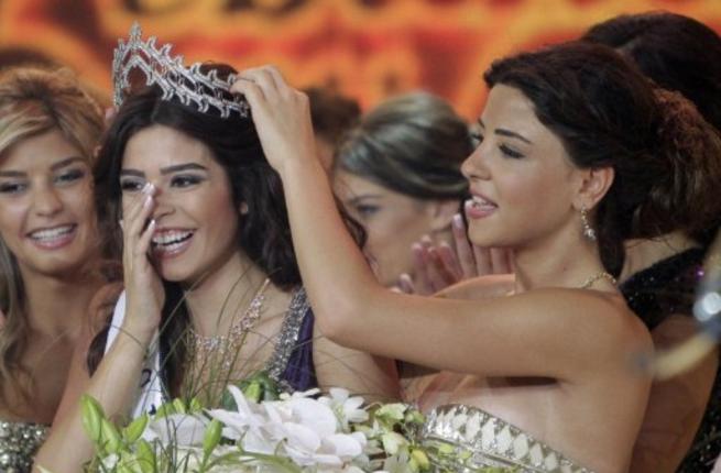 الملكة السابقة رهف عبدالله (يمين) تسلم التاج ليارا خوري ملكة جمال لبنان لعام ٢٠١١.