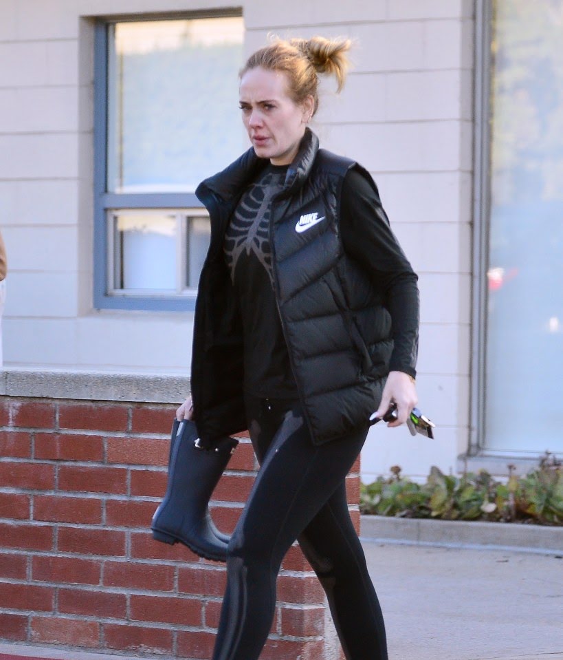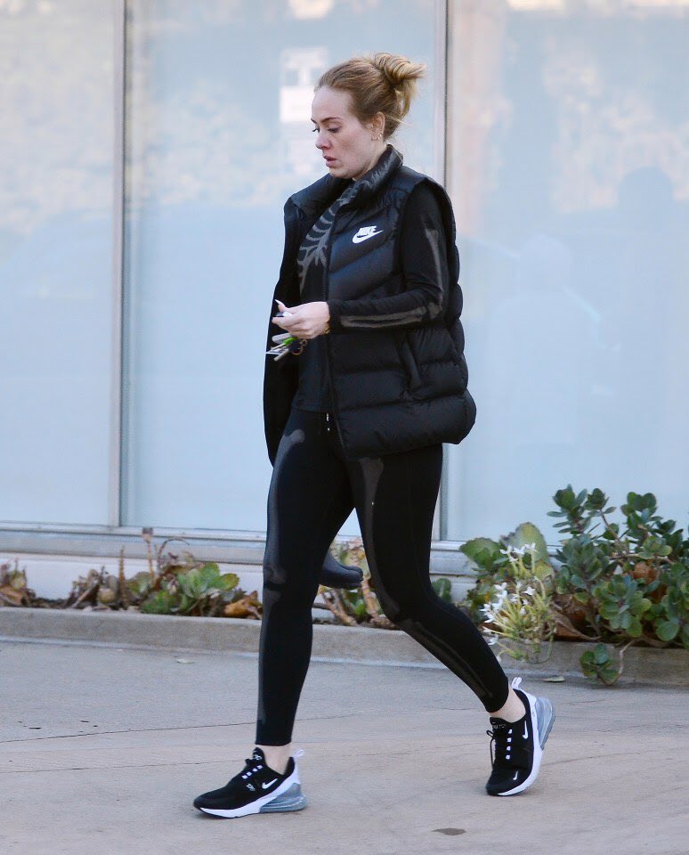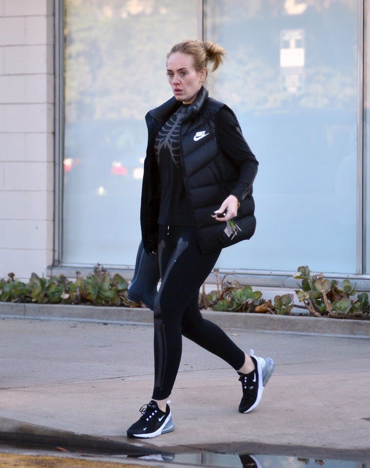 ومؤخرُا، رصدت عدسات الباباراتزي "أديل" تخرج من إحدى المكتبات الواقعة في مدينة لوس أنجلوس مُرتديةً بدلة رياضية سوداء مطبوع عليها شكل هيكل عظمي، وفوقها ارتدت سترة جلد منفوخة لحمايتها من البرد.