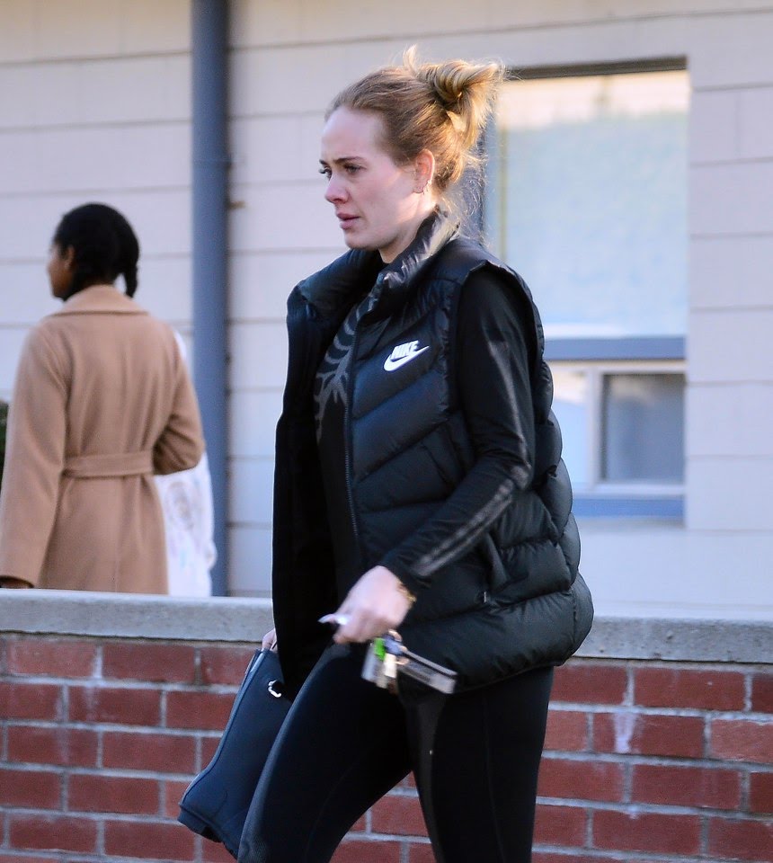 ولم تضع "أديل"، البالغة من العمر 31 عامًا، أي مستحضرات تجميل على بشرتها، وعقدت شعرها الأشفر على شكل كعكة فوضوية، في حين بدا على ملامحها التركيز.