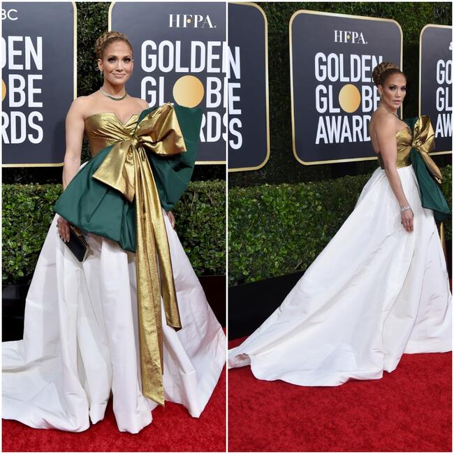 بدت الممثلة الأمريكية كقطعة حلوى ملفوفة بأوراق برَّاقة من عدة طبقات بفستانها من توقيع مصمم الأزياء "فالنتينو".