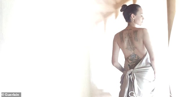 وكشف الفيديو نجمة فيلم Maleficent وهي تبتسم بينما كانت تستمتع برائحة العطر الفخم وأشعة الشمس، إلى أن أظهرت وشمها الملفت للنظر.