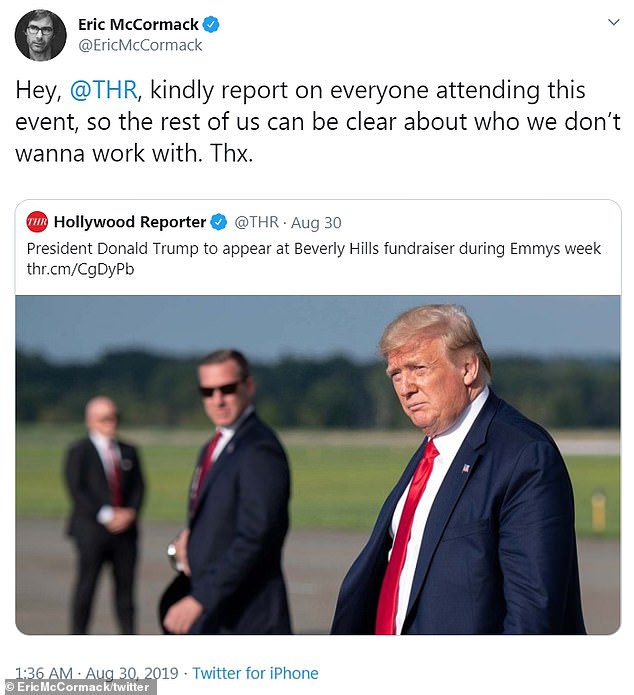 ودفع هذا الأمر النجم "إريك ماكورماك" إلى المطالبة بالإعلان عن أسماء المشاركين في هذا الحفل ليتم مقاطعتهم وإدراجهم في القائمة السوداء في هوليوود، حيث غرّد يوم الجمعة الماضي عبر تويتر قائلاً: "مهلاً، يرجى تقديم تقرير عن كل شخص حضر هذا الحدث، بحيث نكون واضحين حول من لا نريد العمل معه".