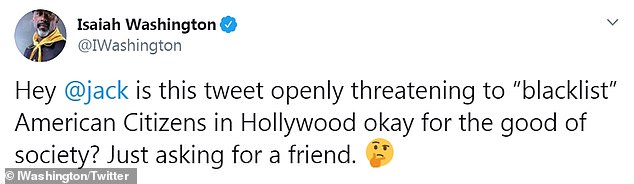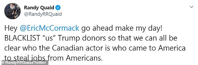 وبدأ النجم أيزيا واشنطن الهجوم على المنشور بقوله: "هل هذه تغريدة تهدد بالقائمة السوداء للمواطنين الأمريكين في هوليوود في مجتمع ينادي بالخير؟"، كما أضاف راندي كويد: "مهلاً إريك ماكورماك، نحن من قام بالتبرع في حفل الدعم لدونالد ترامب حتى نتمكن من معرفة من هو الممثل الكندي الذي جاء إلى اميركا لسرقة الوظائف منا"، حيث أن إريك مواليد كندا ويحمل الجنسية الأمريكية الكندية.