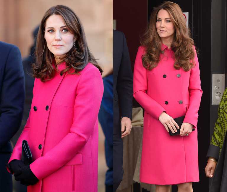 اختارت دوقة كامبريدج فستان معطف أحمر جذاب لزيارتها لأيرلندا الشمالية خلال فبراير هذا العام، ونسقته مع جوارب سوداء وبوت كاحل أنيق، ويبدو أنها أحبت ذلك التصميم للغاية، حيث كررته مرتين، خلال زيارة إلى كندا في 2016، وفي إطلالة أخرى أثناء حضورها بطولة الأمم الستة في مارس 2017.