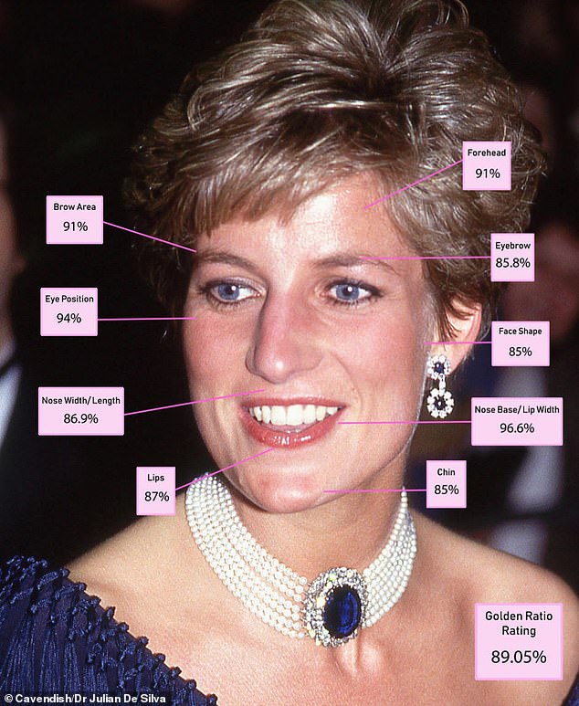وجد أن الأميرة "ديانا" تطابق مقياس النسبة الذهبية للجمال "فاي"، الذي يقيس نسبة جمال الجسد المثالي، وقد حققت نسبة مقدارها 89.05%بالمائة، فقد قيست النسب بين عينيها، حاجبيها، أنفها، وشفتينها، بالإضافة إلى ذقنها وفكها وشكل وجهها، وكانت أقرب إلى فكرة الإغريق القديمة حول الكمال.