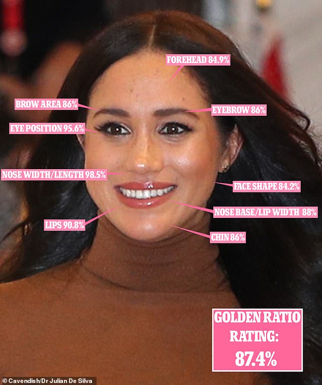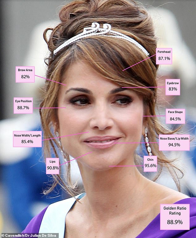 ثم يولى الاهتمام لتماثل ونسبة الوجه؛ ولكي تعتبر "جميلة" وفقًا للنسبة الذهبية، يجب أن يكون طول الأذن مساويًا لطول الأنف ويجب أن يكون عرض العين مساويًا للمسافة بين العينين.