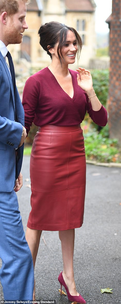وظهرت ميغان بإطلالة شبابية انيقة وهي ترتدي تنورة حمراء من الجلد يبلغ طولها حد الركبة من مجموعة Hugo Boss وبقيمة 369 جنيه أسترليني وهي مطابقة لما ارتدته ملكة إسبانيا ليتيزيا الخميس الماضي في كوريا الجنوبية، إلا أن ميغان نسّقتها مع بلوزة وحذاء من نفس اللون، كما اعتمدت تسريحة مرتفعة لشعرها.