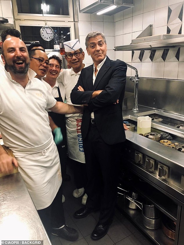 أما جورج، فبدا متألقاً كعادته ببذلته السوداء المخططة، ونسّق معها قميصًا أبيض وحذاءً مطابقًا، بينما دخل إلى مطبخ المطعم، في نهاية ليلته الرومانسية، والتقط صوراً مع الطهاة.
